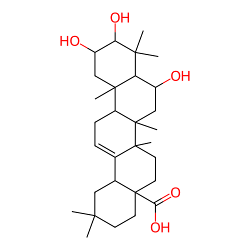 InChI=1S/C30H48O5/c1-25(2)10-12-30(24(34)35)13-11-28(6)17(18(30)14-25)8-9-21-27(5)15-20(32)23(33)26(3,4)22(27)19(31)16-29(21,28)7/h8,18-23,31-33H,9-16H2,1-7H3,(H,34,35)/t18-,19+,20+,21+,22-,23-,27+,28+,29+,30-/m0/s1 |