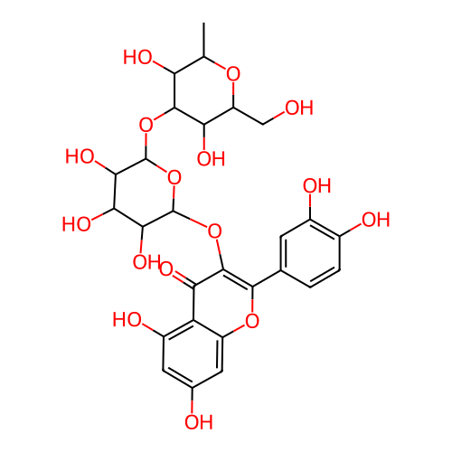 InChI=1S/C27H30O16/c1-8-17(33)24(18(34)15(7-28)39-8)41-26-21(37)20(36)22(38)27(43-26)42-25-19(35)16-13(32)5-10(29)6-14(16)40-23(25)9-2-3-11(30)12(31)4-9/h2-6,8,15,17-18,20-22,24,26-34,36-38H,7H2,1H3/t8-,15+,17-,18-,20+,21+,22+,24+,26+,27+/m0/s1 |