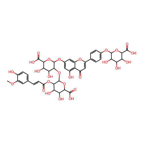 InChI=1S/C43H42O26/c1-61-22-10-14(2-8-18(22)44)3-9-24(47)65-36-30(52)28(50)35(40(59)60)68-43(36)69-37-31(53)29(51)34(39(57)58)67-42(37)63-17-11-19(45)25-20(46)13-21(64-23(25)12-17)15-4-6-16(7-5-15)62-41-32(54)26(48)27(49)33(66-41)38(55)56/h2-13,26-37,41-45,48-54H,1H3,(H,55,56)(H,57,58)(H,59,60)/b9-3+/t26-,27-,28-,29-,30-,31-,32+,33-,34-,35-,36+,37+,41+,42+,43-/m0/s1 |