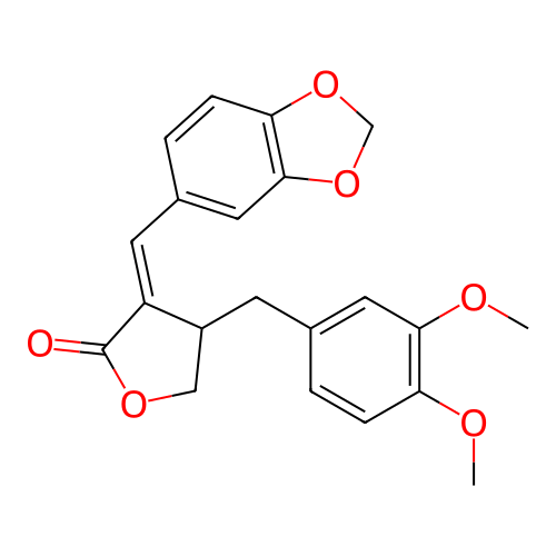 InChI=1S/C21H20O6/c1-23-17-5-3-13(9-19(17)24-2)7-15-11-25-21(22)16(15)8-14-4-6-18-20(10-14)27-12-26-18/h3-6,8-10,15H,7,11-12H2,1-2H3/b16-8+/t15-/m0/s1;InChI=1S/C21H20O6/c1-23-17-5-3-13(9-19(17)24-2)7-15-11-25-21(22)16(15)8-14-4-6-18-20(10-14)27-12-26-18/h3-6,8-10,15H,7,11-12H2,1-2H3/b16-8+;InChI=1S/C21H20O6/c1-23-17-5-3-13(9-19(17)24-2)7-15-11-25-21(22)16(15)8-14-4-6-18-20(10-14)27-12-26-18/h3-6,8-10,15H,7,11-12H2,1-2H3/b16-8+/t15-/m1/s1;InChI=1S/C21H20O6/c1-23-17-5-3-13(9-19(17)24-2)7-15-11-25-21(22)16(15)8-14-4-6-18-20(10-14)27-12-26-18/h3-6,8-10,15H,7,11-12H2,1-2H3 |