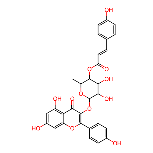 InChI=1S/C30H26O12/c1-14-27(41-22(35)11-4-15-2-7-17(31)8-3-15)25(37)26(38)30(39-14)42-29-24(36)23-20(34)12-19(33)13-21(23)40-28(29)16-5-9-18(32)10-6-16/h2-14,25-27,30-34,37-38H,1H3/b11-4-/t14-,25-,26+,27-,30-/m0/s1 |