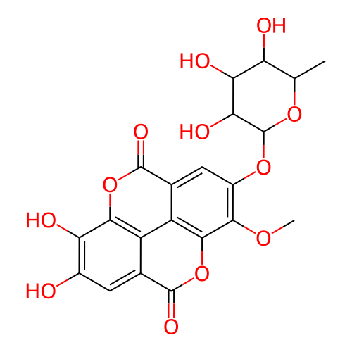 InChI=1S/C21H18O12/c1-5-12(23)14(25)15(26)21(30-5)31-9-4-7-11-10-6(19(27)33-18(11)16(9)29-2)3-8(22)13(24)17(10)32-20(7)28/h3-5,12,14-15,21-26H,1-2H3/t5-,12-,14+,15+,21-/m0/s1 |