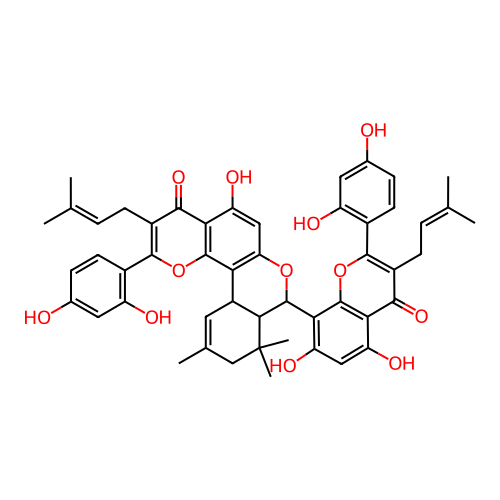 InChI=1S/C50H48O12/c1-22(2)8-12-29-43(58)39-34(55)19-35(56)41(48(39)62-46(29)28-15-11-26(52)18-33(28)54)49-42-31(16-24(5)21-50(42,6)7)38-37(60-49)20-36(57)40-44(59)30(13-9-23(3)4)45(61-47(38)40)27-14-10-25(51)17-32(27)53/h8-11,14-20,31,42,49,51-57H,12-13,21H2,1-7H3 |