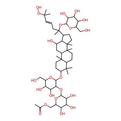 InChI=1S/C50H84O21/c1-23(53)64-22-28-35(57)37(59)39(61)42(67-28)69-41-38(60)34(56)27(21-52)66-44(41)68-31-13-16-47(6)29(46(31,4)5)12-18-48(7)30(47)19-25(54)32-24(11-17-49(32,48)8)50(9,15-10-14-45(2,3)71-63)70-43-40(62)36(58)33(55)26(20-51)65-43/h10,14,24-44,51-52,54-63H,11-13,15-22H2,1-9H3/b14-10+/t24-,25+,26+,27+,28+,29-,30+,31-,32-,33+,34+,35+,36-,37-,38-,39+,40+,41+,42-,43-,44-,47-,48+,49+,50-/m0/s1 |
