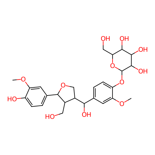 InChI=1S/C26H34O12/c1-34-18-8-13(3-5-16(18)29)25-14(9-27)15(11-36-25)21(30)12-4-6-17(19(7-12)35-2)37-26-24(33)23(32)22(31)20(10-28)38-26/h3-8,14-15,20-33H,9-11H2,1-2H3/t14?,15?,20-,21?,22-,23+,24-,25?,26-/m1/s1 |