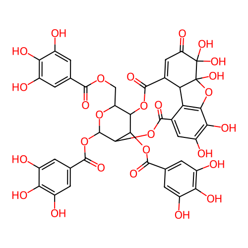 InChI=1S/C41H30O27/c42-15-1-10(2-16(43)26(15)50)34(54)62-9-22-30-32(65-35(55)11-3-17(44)27(51)18(45)4-11)33(39(63-22)67-36(56)12-5-19(46)28(52)20(47)6-12)66-37(57)13-7-21(48)29(53)31-24(13)25-14(38(58)64-30)8-23(49)40(59,60)41(25,61)68-31/h1-8,22,25,30,32-33,39,42-48,50-53,59-61H,9H2/t22-,25+,30-,32+,33-,39+,41?/m1/s1 |