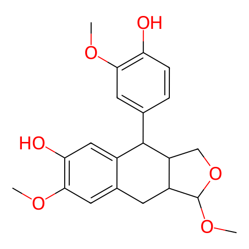 InChI=1S/C21H24O6/c1-24-18-7-11(4-5-16(18)22)20-13-9-17(23)19(25-2)8-12(13)6-14-15(20)10-27-21(14)26-3/h4-5,7-9,14-15,20-23H,6,10H2,1-3H3;InChI=1S/C21H24O6/c1-24-18-7-11(4-5-16(18)22)20-13-9-17(23)19(25-2)8-12(13)6-14-15(20)10-27-21(14)26-3/h4-5,7-9,14-15,20-23H,6,10H2,1-3H3/t14-,15+,20+,21+/m1/s1;InChI=1S/C21H24O6/c1-24-18-7-11(4-5-16(18)22)20-13-9-17(23)19(25-2)8-12(13)6-14-15(20)10-27-21(14)26-3/h4-5,7-9,14-15,20-23H,6,10H2,1-3H3/t14-,15+,20?,21?/m0/s1 |