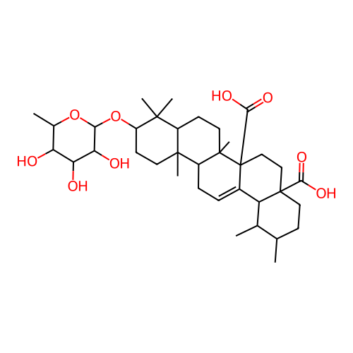 InChI=1S/C36H56O9/c1-18-10-15-35(30(40)41)16-17-36(31(42)43)21(25(35)19(18)2)8-9-23-33(6)13-12-24(32(4,5)22(33)11-14-34(23,36)7)45-29-28(39)27(38)26(37)20(3)44-29/h8,18-20,22-29,37-39H,9-17H2,1-7H3,(H,40,41)(H,42,43)/t18-,19+,20+,22+,23-,24+,25+,26+,27-,28-,29+,33+,34-,35+,36-/m1/s1;InChI=1S/C36H56O9/c1-18-10-15-35(30(40)41)16-17-36(31(42)43)21(25(35)19(18)2)8-9-23-33(6)13-12-24(32(4,5)22(33)11-14-34(23,36)7)45-29-28(39)27(38)26(37)20(3)44-29/h8,18-20,22-29,37-39H,9-17H2,1-7H3,(H,40,41)(H,42,43)/t18-,19+,20+,22?,23-,24+,25+,26+,27-,28-,29+,33+,34-,35+,36-/m1/s1;InChI=1S/C36H56O9/c1-18-10-15-35(30(40)41)16-17-36(31(42)43)21(25(35)19(18)2)8-9-23-33(6)13-12-24(32(4,5)22(33)11-14-34(23,36)7)45-29-28(39)27(38)26(37)20(3)44-29/h8,18-20,22-29,37-39H,9-17H2,1-7H3,(H,40,41)(H,42,43)/t18?,19?,20?,22?,23?,24?,25?,26?,27?,28?,29?,33-,34+,35-,36+/m0/s1;InChI=1S/C36H56O9/c1-18-10-15-35(30(40)41)16-17-36(31(42)43)21(25(35)19(18)2)8-9-23-33(6)13-12-24(32(4,5)22(33)11-14-34(23,36)7)45-29-28(39)27(38)26(37)20(3)44-29/h8,18-20,22-29,37-39H,9-17H2,1-7H3,(H,40,41)(H,42,43)/t18-,19+,20+,22?,23-,24+,25+,26+,27-,28-,29+,33+,34-,35+,36-/m0/s1;InChI=1S/C36H56O9/c1-18-10-15-35(30(40)41)16-17-36(31(42)43)21(25(35)19(18)2)8-9-23-33(6)13-12-24(32(4,5)22(33)11-14-34(23,36)7)45-29-28(39)27(38)26(37)20(3)44-29/h8,18-20,22-29,37-39H,9-17H2,1-7H3,(H,40,41)(H,42,43) |