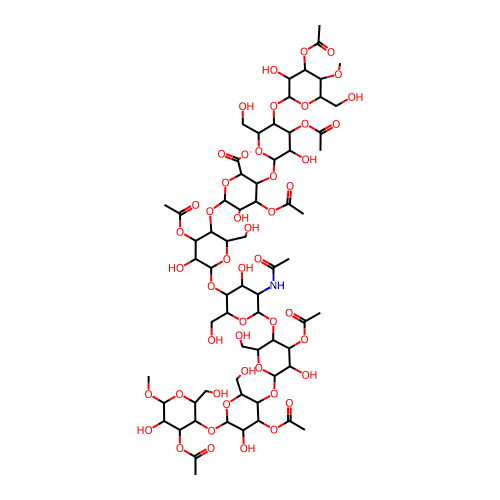 InChI=1S/C66H101NO49/c1-18(75)67-33-34(83)42(26(11-68)102-59(33)110-44-29(14-71)106-63(38(87)51(44)97-21(4)78)113-46-30(15-72)107-64(39(88)53(46)99-23(6)80)111-45-28(13-70)103-60(94-10)35(84)50(45)96-20(3)77)109-61-37(86)52(98-22(5)79)48(32(17-74)105-61)114-66-41(90)55(101-25(8)82)56(57(116-66)58(91)92)115-65-40(89)54(100-24(7)81)47(31(16-73)108-65)112-62-36(85)49(95-19(2)76)43(93-9)27(12-69)104-62/h26-57,59-66,68-74,83-90H,11-17H2,1-10H3,(H,67,75)(H,91,92)/p-1/t26-,27-,28-,29-,30-,31-,32-,33+,34-,35+,36+,37+,38+,39+,40+,41+,42-,43-,44-,45-,46-,47-,48-,49-,50-,51-,52-,53-,54-,55-,56+,57+,59-,60+,61-,62-,63-,64-,65-,66+/m1/s1;InChI=1S/C66H101NO49/c1-18(75)67-33-34(83)42(26(11-68)102-59(33)110-44-29(14-71)106-63(38(87)51(44)97-21(4)78)113-46-30(15-72)107-64(39(88)53(46)99-23(6)80)111-45-28(13-70)103-60(94-10)35(84)50(45)96-20(3)77)109-61-37(86)52(98-22(5)79)48(32(17-74)105-61)114-66-41(90)55(101-25(8)82)56(57(116-66)58(91)92)115-65-40(89)54(100-24(7)81)47(31(16-73)108-65)112-62-36(85)49(95-19(2)76)43(93-9)27(12-69)104-62/h26-57,59-66,68-74,83-90H,11-17H2,1-10H3,(H,67,75)(H,91,92)/p-1 |