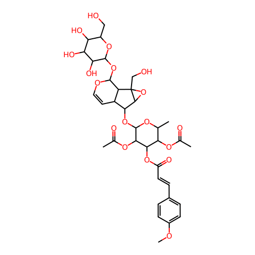 InChI=1S/C35H44O18/c1-15-27(47-16(2)38)29(50-22(40)10-7-18-5-8-19(44-4)9-6-18)30(48-17(3)39)34(46-15)51-28-20-11-12-45-32(23(20)35(14-37)31(28)53-35)52-33-26(43)25(42)24(41)21(13-36)49-33/h5-12,15,20-21,23-34,36-37,41-43H,13-14H2,1-4H3/b10-7+/t15-,20+,21+,23+,24+,25-,26+,27-,28-,29+,30+,31-,32-,33-,34-,35+/m0/s1 |