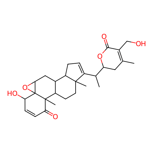 InChI=1S/C28H36O6/c1-14-11-21(33-25(32)17(14)13-29)15(2)18-5-6-19-16-12-24-28(34-24)23(31)8-7-22(30)27(28,4)20(16)9-10-26(18,19)3/h5,7-8,15-16,19-21,23-24,29,31H,6,9-13H2,1-4H3/t15-,16-,19-,20-,21+,23-,24+,26+,27-,28+/m0/s1 |