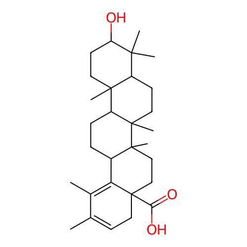 InChI=1S/C30H46O3/c1-18-10-15-30(25(32)33)17-16-28(6)20(24(30)19(18)2)8-9-22-27(5)13-12-23(31)26(3,4)21(27)11-14-29(22,28)7/h10,20-23,31H,8-9,11-17H2,1-7H3,(H,32,33)/t20-,21+,22-,23-,27+,28-,29-,30+/m1/s1 |