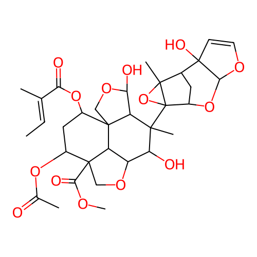 InChI=1S/C33H42O14/c1-7-14(2)24(36)45-17-11-18(44-15(3)34)31(26(38)40-6)13-42-20-21(31)30(17)12-43-25(37)22(30)28(4,23(20)35)33-19-10-16(29(33,5)47-33)32(39)8-9-41-27(32)46-19/h7-9,16-23,25,27,35,37,39H,10-13H2,1-6H3/b14-7+/t16-,17-,18+,19?,20+,21+,22-,23+,25+,27-,28-,29-,30?,31-,32-,33-/m0/s1 |