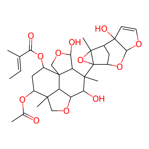 InChI=1S/C32H42O12/c1-7-14(2)24(35)42-18-11-17(41-15(3)33)27(4)12-39-20-21(27)30(18)13-40-25(36)22(30)28(5,23(20)34)32-19-10-16(29(32,6)44-32)31(37)8-9-38-26(31)43-19/h7-9,16-23,25-26,34,36-37H,10-13H2,1-6H3/b14-7+/t16-,17+,18-,19?,20+,21-,22-,23+,25+,26-,27+,28-,29-,30?,31-,32-/m0/s1 |