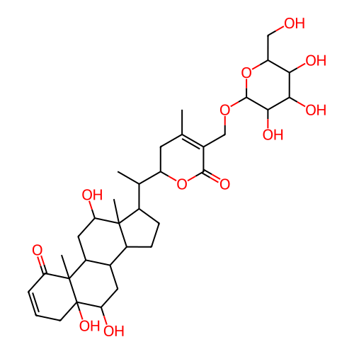 InChI=1S/C34H50O12/c1-15-10-22(45-30(42)18(15)14-44-31-29(41)28(40)27(39)23(13-35)46-31)16(2)19-7-8-20-17-11-26(38)34(43)9-5-6-24(36)33(34,4)21(17)12-25(37)32(19,20)3/h5-6,16-17,19-23,25-29,31,35,37-41,43H,7-14H2,1-4H3/t16-,17-,19+,20-,21-,22+,23+,25+,26-,27+,28-,29+,31+,32+,33-,34+/m0/s1 |