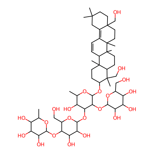 InChI=1S/C54H88O21/c1-24-33(59)36(62)39(65)45(68-24)73-42-29(21-56)71-47(41(67)38(42)64)74-43-34(60)25(2)69-48(44(43)75-46-40(66)37(63)35(61)28(20-55)70-46)72-32-12-13-50(5)30(51(32,6)22-57)11-14-53(8)31(50)10-9-26-27-19-49(3,4)15-17-54(27,23-58)18-16-52(26,53)7/h9-10,24-25,28-48,55-67H,11-23H2,1-8H3 |