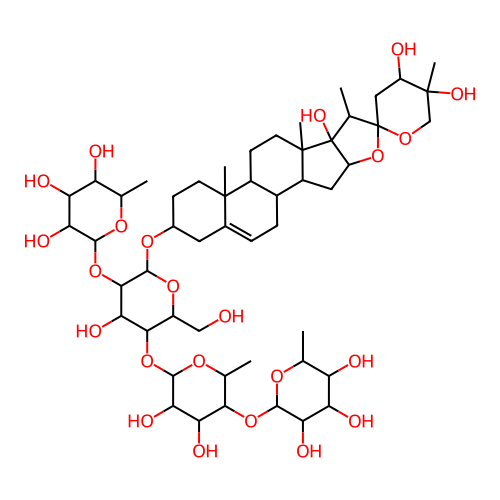InChI=1S/C51H82O23/c1-19-31(54)33(56)36(59)43(66-19)71-40-21(3)68-45(38(61)35(40)58)72-41-28(17-52)70-46(42(39(41)62)73-44-37(60)34(57)32(55)20(2)67-44)69-24-10-12-47(5)23(14-24)8-9-25-26(47)11-13-48(6)27(25)15-30-51(48,64)22(4)50(74-30)16-29(53)49(7,63)18-65-50/h8,19-22,24-46,52-64H,9-18H2,1-7H3/t19-,20-,21-,22+,24-,25+,26-,27-,28+,29+,30-,31-,32-,33+,34+,35-,36+,37+,38+,39-,40-,41+,42+,43-,44-,45-,46+,47-,48-,49+,50+,51+/m0/s1 |
