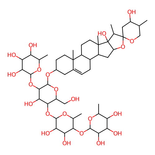 InChI=1S/C51H82O22/c1-19-18-64-50(16-29(19)53)23(5)51(63)31(73-50)15-28-26-9-8-24-14-25(10-12-48(24,6)27(26)11-13-49(28,51)7)68-47-43(72-45-38(60)35(57)33(55)21(3)66-45)40(62)42(30(17-52)69-47)71-46-39(61)36(58)41(22(4)67-46)70-44-37(59)34(56)32(54)20(2)65-44/h8,19-23,25-47,52-63H,9-18H2,1-7H3/t19-,20-,21-,22-,23+,25-,26+,27-,28-,29+,30+,31-,32-,33-,34+,35+,36-,37+,38+,39+,40-,41-,42+,43+,44-,45-,46-,47+,48-,49-,50+,51+/m0/s1 |