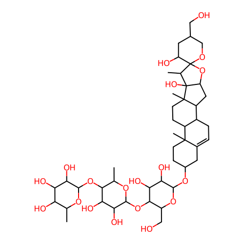 InChI=1S/C45H72O19/c1-18-30(49)31(50)34(53)39(58-18)62-37-19(2)59-40(35(54)32(37)51)63-38-27(16-47)61-41(36(55)33(38)52)60-23-8-10-42(4)22(13-23)6-7-24-25(42)9-11-43(5)26(24)14-29-44(43,56)20(3)45(64-29)28(48)12-21(15-46)17-57-45/h6,18-21,23-41,46-56H,7-17H2,1-5H3/t18-,19-,20-,21-,23-,24+,25-,26-,27+,28-,29-,30-,31+,32-,33+,34+,35+,36+,37-,38+,39-,40-,41+,42-,43-,44+,45+/m0/s1 |