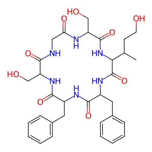 InChI=1S/C32H42N6O9/c1-19(12-13-39)27-32(47)36-23(15-21-10-6-3-7-11-21)29(44)35-22(14-20-8-4-2-5-9-20)30(45)37-24(17-40)28(43)33-16-26(42)34-25(18-41)31(46)38-27/h2-11,19,22-25,27,39-41H,12-18H2,1H3,(H,33,43)(H,34,42)(H,35,44)(H,36,47)(H,37,45)(H,38,46)/t19?,22-,23-,24-,25-,27-/m0/s1 |