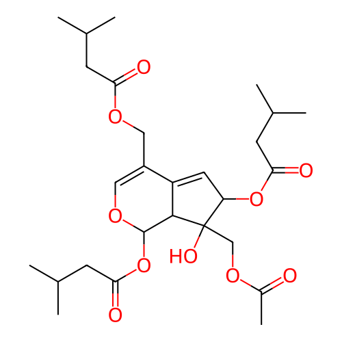 InChI=1S/C27H40O10/c1-15(2)8-22(29)33-12-19-13-34-26(37-24(31)10-17(5)6)25-20(19)11-21(36-23(30)9-16(3)4)27(25,32)14-35-18(7)28/h11,13,15-17,21,25-26,32H,8-10,12,14H2,1-7H3/t21-,25+,26-,27+/m0/s1 |