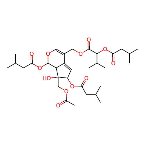 InChI=1S/C32H48O12/c1-17(2)10-25(34)42-24-13-23-22(14-39-30(37)29(20(7)8)43-26(35)11-18(3)4)15-40-31(44-27(36)12-19(5)6)28(23)32(24,38)16-41-21(9)33/h13,15,17-20,24,28-29,31,38H,10-12,14,16H2,1-9H3/t24-,28+,29?,31-,32+/m0/s1 |