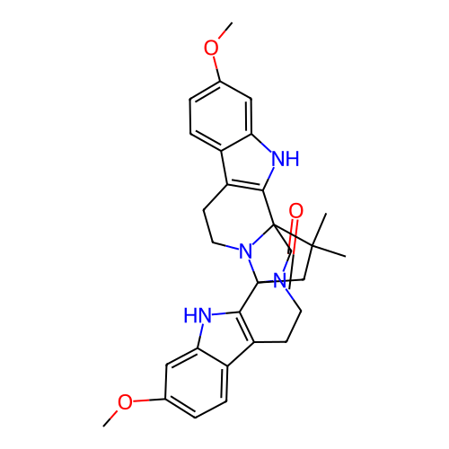 InChI=1S/C29H30N4O3/c1-27(2)15-28-24-20(18-7-5-16(35-3)13-22(18)30-24)9-11-32(28)26(34)29(27)25-21(10-12-33(28)29)19-8-6-17(36-4)14-23(19)31-25/h5-8,13-14,30-31H,9-12,15H2,1-4H3/t28-,29+/m1/s1 |