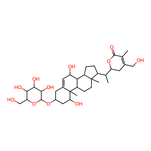 InChI=1S/C34H52O11/c1-15-17(13-35)9-24(44-31(15)42)16(2)20-5-6-21-27-22(7-8-33(20,21)3)34(4)18(11-23(27)37)10-19(12-26(34)38)43-32-30(41)29(40)28(39)25(14-36)45-32/h11,16,19-30,32,35-41H,5-10,12-14H2,1-4H3/t16-,19+,20+,21-,22-,23+,24+,25+,26-,27-,28+,29-,30+,32+,33+,34-/m0/s1 |