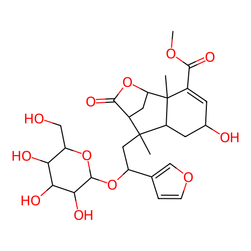 InChI=1S/C27H36O12/c1-26(9-16(12-4-5-36-11-12)37-25-22(32)21(31)20(30)17(10-28)38-25)14-8-19(39-24(14)34)27(2)15(23(33)35-3)6-13(29)7-18(26)27/h4-6,11,13-14,16-22,25,28-32H,7-10H2,1-3H3/t13-,14-,16?,17+,18-,19-,20+,21-,22+,25+,26+,27-/m0/s1 |