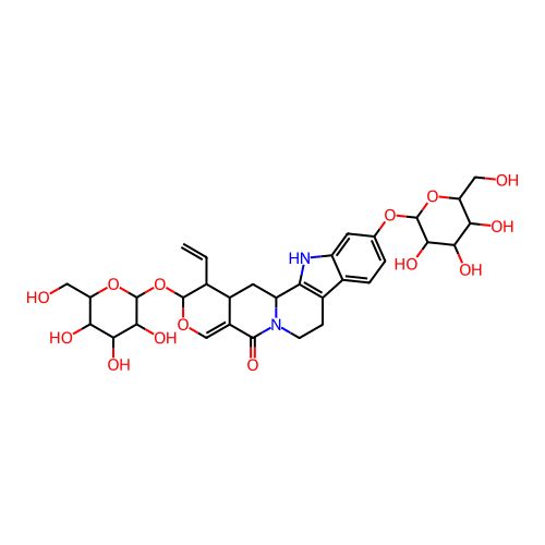 InChI=1S/C32H40N2O14/c1-2-13-16-8-19-22-15(14-4-3-12(7-18(14)33-22)45-31-27(41)25(39)23(37)20(9-35)46-31)5-6-34(19)29(43)17(16)11-44-30(13)48-32-28(42)26(40)24(38)21(10-36)47-32/h2-4,7,11,13,16,19-21,23-28,30-33,35-42H,1,5-6,8-10H2/t13-,16+,19-,20-,21-,23-,24-,25+,26+,27-,28-,30+,31-,32+/m1/s1 |