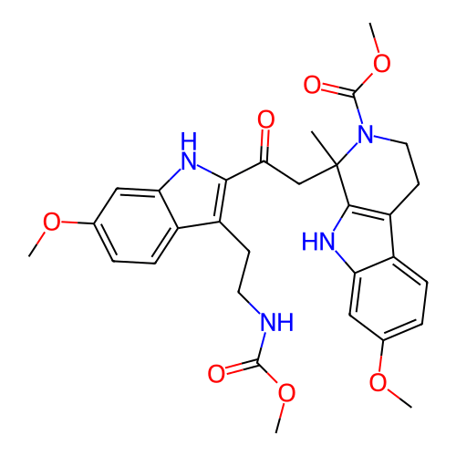InChI=1S/C30H34N4O7/c1-30(27-22(11-13-34(30)29(37)41-5)20-9-7-18(39-3)15-24(20)33-27)16-25(35)26-21(10-12-31-28(36)40-4)19-8-6-17(38-2)14-23(19)32-26/h6-9,14-15,32-33H,10-13,16H2,1-5H3,(H,31,36)/t30-/m1/s1 |