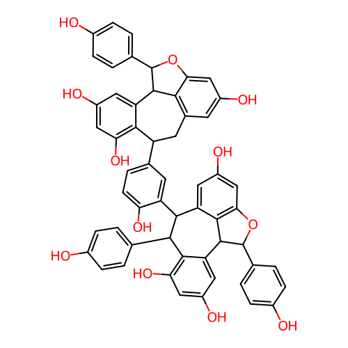 InChI=1S/C56H42O12/c57-30-8-1-25(2-9-30)48-50(40-20-36(63)24-46-52(40)54(41-19-35(62)22-44(66)51(41)48)56(68-46)27-5-12-32(59)13-6-27)38-16-28(7-14-42(38)64)37-17-29-15-33(60)23-45-47(29)53(39-18-34(61)21-43(65)49(37)39)55(67-45)26-3-10-31(58)11-4-26/h1-16,18-24,37,48,50,53-66H,17H2/t37-,48+,50-,53-,54-,55+,56+/m0/s1 |