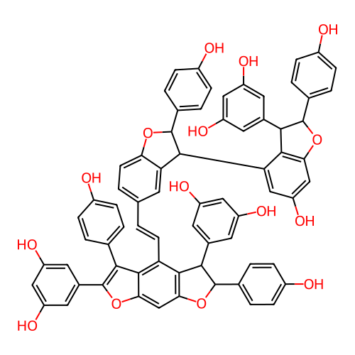 InChI=1S/C70H50O15/c71-42-11-3-35(4-12-42)60-64-53(65-59(33-58(64)85-70(60)41-26-50(79)30-51(80)27-41)84-67(36-5-13-43(72)14-6-36)61(65)39-22-46(75)28-47(76)23-39)19-1-34-2-20-56-54(21-34)63(69(82-56)38-9-17-45(74)18-10-38)55-31-52(81)32-57-66(55)62(40-24-48(77)29-49(78)25-40)68(83-57)37-7-15-44(73)16-8-37/h1-33,61-63,67-69,71-81H/b19-1+/t61-,62-,63-,67+,68+,69-/m0/s1 |