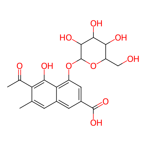 InChI=1S/C20H22O10/c1-7-3-9-4-10(19(27)28)5-11(14(9)16(24)13(7)8(2)22)29-20-18(26)17(25)15(23)12(6-21)30-20/h3-5,12,15,17-18,20-21,23-26H,6H2,1-2H3,(H,27,28)/t12-,15-,17+,18-,20-/m1/s1 |