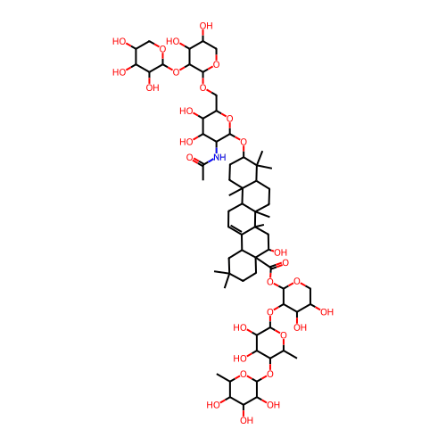 InChI=1S/C65H105NO29/c1-25-39(72)45(78)48(81)55(88-25)92-50-26(2)89-56(49(82)46(50)79)94-52-42(75)32(70)23-86-58(52)95-59(83)65-18-17-60(4,5)19-29(65)28-11-12-35-62(8)15-14-37(61(6,7)34(62)13-16-63(35,9)64(28,10)20-36(65)71)91-53-38(66-27(3)67)44(77)43(76)33(90-53)24-87-57-51(41(74)31(69)22-85-57)93-54-47(80)40(73)30(68)21-84-54/h11,25-26,29-58,68-82H,12-24H2,1-10H3,(H,66,67)/t25-,26-,29-,30+,31-,32+,33+,34-,35+,36+,37-,38+,39-,40-,41-,42-,43+,44+,45+,46-,47+,48+,49+,50-,51+,52+,53-,54-,55-,56-,57-,58-,62-,63+,64+,65+/m0/s1 |