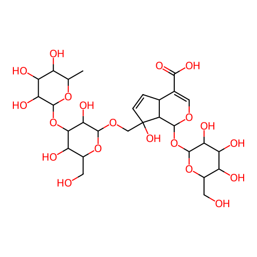 InChI=1S/C28H42O20/c1-8-14(31)17(34)19(36)26(44-8)47-22-16(33)12(5-30)45-25(21(22)38)43-7-28(41)3-2-9-10(23(39)40)6-42-24(13(9)28)48-27-20(37)18(35)15(32)11(4-29)46-27/h2-3,6,8-9,11-22,24-27,29-38,41H,4-5,7H2,1H3,(H,39,40)/t8-,9+,11+,12+,13+,14-,15+,16+,17+,18-,19+,20+,21+,22-,24-,25+,26-,27-,28-/m0/s1 |