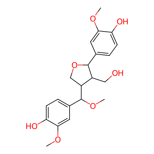 InChI=1S/C21H26O7/c1-25-18-8-12(4-6-16(18)23)20(27-3)15-11-28-21(14(15)10-22)13-5-7-17(24)19(9-13)26-2/h4-9,14-15,20-24H,10-11H2,1-3H3/t14-,15-,20?,21+/m0/s1 |