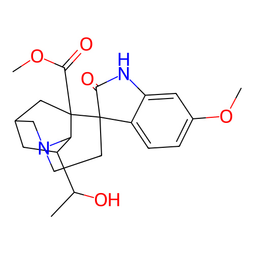 InChI=1S/C22H28N2O5/c1-12(25)15-8-13-10-22(20(27)29-3)18(15)24(11-13)7-6-21(22)16-5-4-14(28-2)9-17(16)23-19(21)26/h4-5,9,12-13,15,18,25H,6-8,10-11H2,1-3H3,(H,23,26)/t12-,13+,15+,18-,21+,22+/m0/s1 |