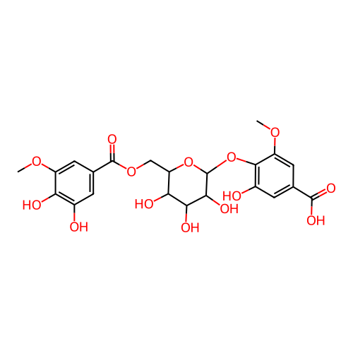 InChI=1S/C22H24O14/c1-32-12-6-9(4-10(23)15(12)25)21(31)34-7-14-16(26)17(27)18(28)22(35-14)36-19-11(24)3-8(20(29)30)5-13(19)33-2/h3-6,14,16-18,22-28H,7H2,1-2H3,(H,29,30)/t14-,16-,17+,18-,22+/m1/s1 |