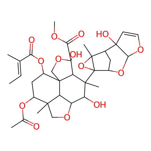 InChI=1S/C34H44O14/c1-8-15(2)24(37)46-19-12-18(45-16(3)35)28(4)13-43-21-22(28)31(19)14-44-33(40,26(38)41-7)25(31)29(5,23(21)36)34-20-11-17(30(34,6)48-34)32(39)9-10-42-27(32)47-20/h8-10,17-23,25,27,36,39-40H,11-14H2,1-7H3/b15-8+/t17-,18+,19-,20?,21-,22-,23+,25-,27-,28+,29+,30-,31?,32-,33-,34-/m0/s1 |